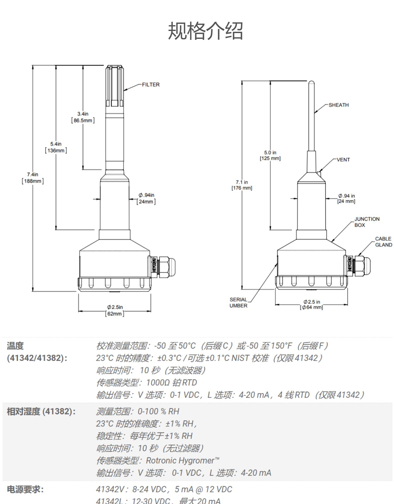 41342 型温度探头只提供精确的温度测量。提供三种输出选项: 0-1 VDC、4-20 mA 和 4 线 RTD。