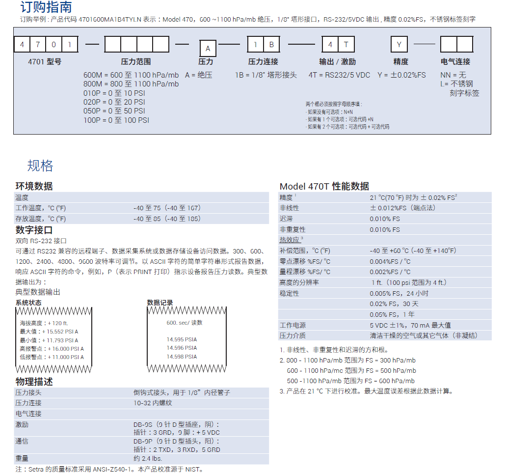Setra 的470T 型号是采用微处理器的多功能高精度数字压力变送器。它将Setra 独特的SETRACERAM® 8868体育官网入口、先进的数字电路和成熟的软件系统结合在一起,以小型、低功耗封装提供了精度达±0.02%(全量程)的系统。
