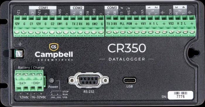 CR350是一款低功耗数据采集器,用于测量8868体育官网入口、分析数据、存储数据和程序。内部锂电池维持时钟运行。主板上的类Basic编程语言和所有Campbell Scientific 的数据采集器一样,支持数据处理和分析。