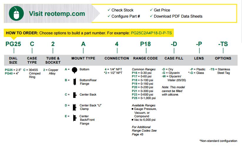 REOTEMP的PG25/40C系列压力表是一种经济型的选择,尤其在考虑环境腐蚀和振动的情况下。不锈钢表壳和表圈具有出色的耐腐蚀性,可用于振动应用。它适用于所有与铜合金相容的流体。