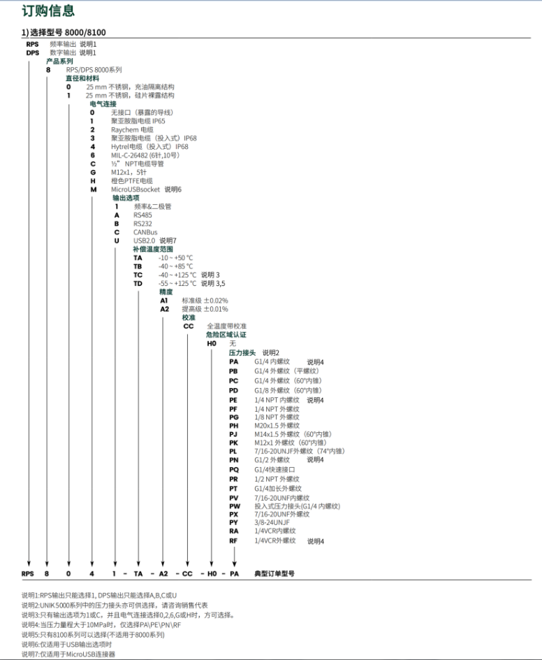 其他大气压量程可根据需求咨询销售代表。更高的压力量程可在RPS/DPS 8000系列中提供。